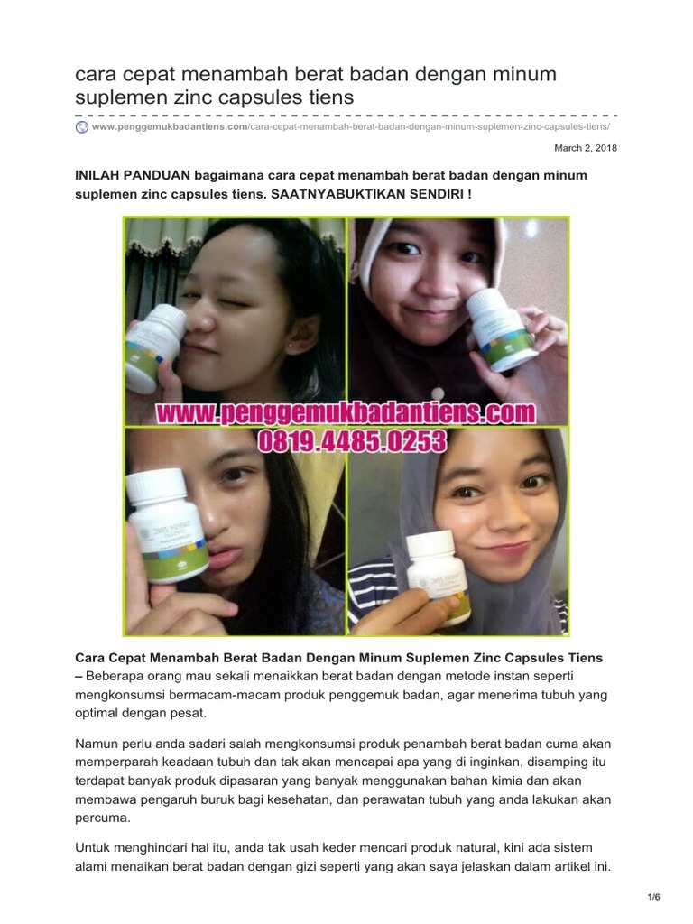 Tidak heran setelah mengonsumsi kapsul zinc, Anda akan makan lebih banyak, menyebabkan kenaikan berat badan lebih cepat. CARA MINUM ZINC TIENS PENAMBAH BERAT BADAN. Zinc Tiens bisa membantu seseorang menambah nafsu makannya, sehingga penambahan berat badan bukanlah hal yang mustahil lagi.